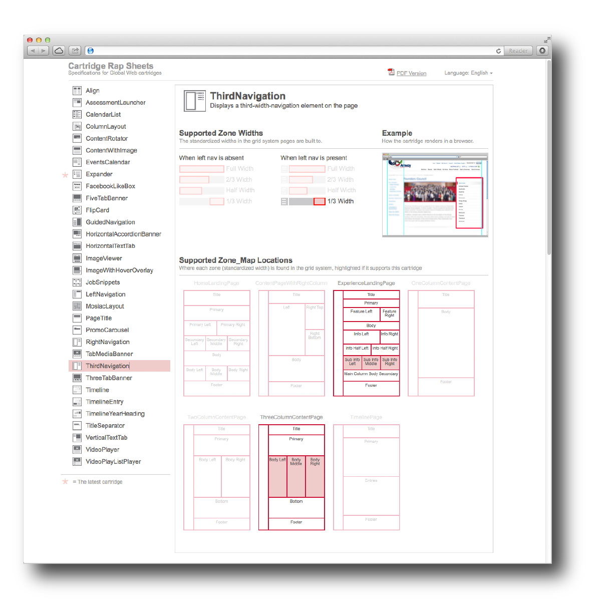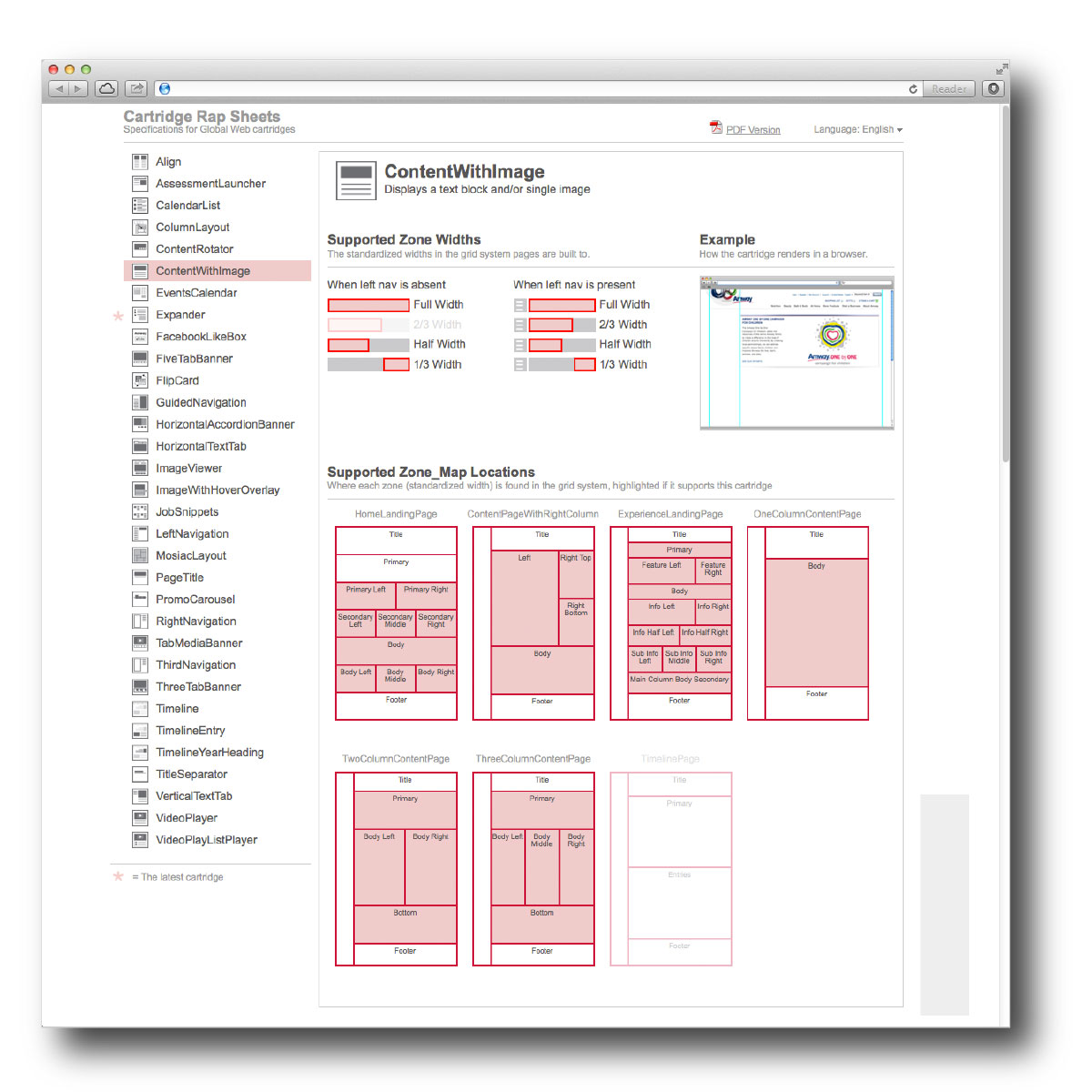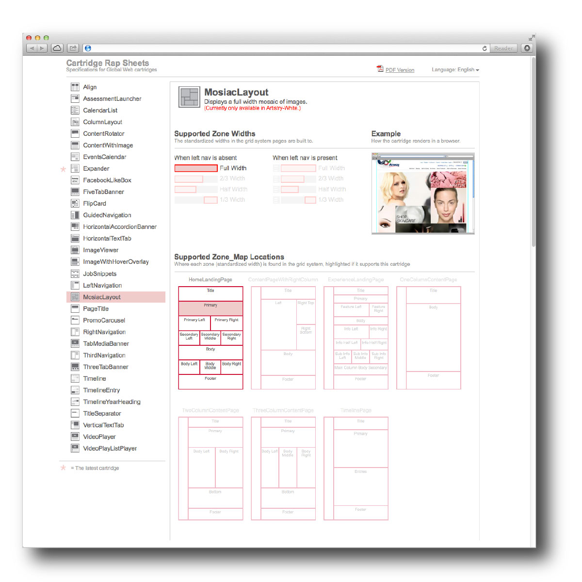Backend tool allowed content loaders to lookup how a homegrown modular component system could be used in relation to various templates.